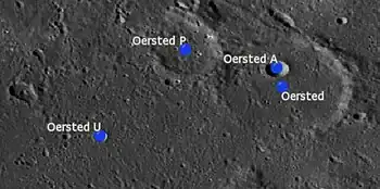 El borde norte de Oersted ha sido superpuesto por un pequeño cráter inundado por la lava. Justo al sur se halla un cráter más reciente, todavía intacto, denominado Oersted A, que se formó después de que Oersted fuese invadido por los flujos de basalto. Al noroeste, el cráter inundado Oersted P se une al sector noroeste del borde exterior.