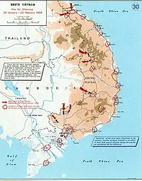 - Ataques con varias divisiones e incluso vehículos de combate contra las posiciones de las Fuerzas Especiales en Loc Ninh, en las Tierras Altas Centrales. Esta posición era de gran importancia porque cortaba la ruta Ho Chi Minh de camino hacia Saigón. Además, otros autores,[9] añaden el sitio de Khe Sanh como parte de la operación para mantener distraídas a las fuerzas estadounidenses del objetivo principal.