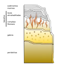 Las ofiolitas son asociaciones de rocas ultramáficas, máficas y máfico volcánicas constituyentes de la corteza y litosfera oceánica. También pueden aparecer sobre corteza continental como consecuencia de un proceso de obducción.[1] Existe una disputa científica sobre si las ofiolitas representan la típica corteza oceánica.[2]