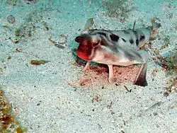 El pez murciélago de labios rojos o pez murciélago de las Galápagos (Ogcocephalus darwini) es un pez de morfología inusual que se encuentra alrededor de las Islas Galápagos y fuera de Perú en profundidades de 3 a 76 m.[1] El pez murciélago de labios rojos está estrechamente relacionado con el pez murciélago de labios rosados (Ogcocephalus porrectus), que se encuentra cerca de la isla del Coco en la costa del Pacífico de Costa Rica. Este pez es principalmente conocido por sus brillantes labios rojos. Los peces murciélago no son buenos nadadores; usan sus aletas pectorales para "caminar" en el fondo del océano. Cuando el pez murciélago alcanza su madurez, su aleta dorsal se convierte en una sola proyección o espina (se piensa que funciona principalmente como un señuelo para la presa). Al igual que otros rape, el pez murciélago de labios rojos tiene una estructura en su cabeza conocida como illicium. Esta estructura se emplea para atraer presas.