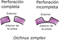 - Oichnus simplex se caracteriza por presentar un contorno circular a levemente ovalado, las pareces del orificio son rectas e inclinadas, de modo que el orificio externo, tiene menor diámetro que el orificio internio, que da hacia el interior de la presa (ver la figura del orificio completo). A su vez, en los casos en los que el orificio está incompleto (por ejemplo, porque el depredador fue removido por el ojeaje o por otro depredador), el fondo del mismo es plano o levemente cóncavo, como se puede observar en la figura inferior. Los gastrópodos de la familia Muricidae usualmente dejan marcas de este tipo en su actividad de perforación.[1]