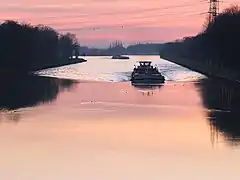 Olas de un barco y algunas aves acuáticas, en el canal Rin-Herne
