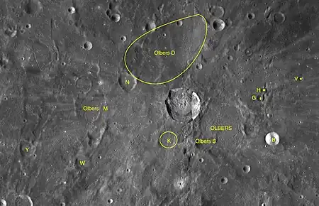 Por convención estos elementos son identificados en los mapas lunares poniendo la letra en el lado del punto medio del cráter que está más cercano a Olbers.
