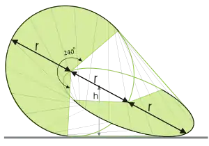 - Un tercio del perímetro de cada círculo descansa sobre la envolvente convexa, formando parte de la superficie del oloide. Por lo tanto, el mismo oloide se puede definir también como la envolvente convexa de dos arcos de radio r, cada uno de ellos abarcando un ángulo de 4π/3, cuyos centros estén colocados a una distancia r y con orientación perpendicular.
