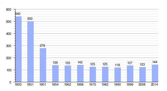 Los datos demográficos contemplados en este gráfico de la comuna de Omonville-la-Petite[4] se han cogido de 1800 a 1999 de la página francesa EHESS/Cassini, y los demás datos de la página del INSEE.[5]