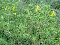 Hierba anual, ramificada, ascendente y cubierta densamente de pelos glandulares amarillentos y pegajosos. Las hojas son trifoliadas en la parte inferior, pero unifoliada en la parte alta. Las flores de color limón, miden unos 15 a 20 mm, y el fruto de 9 a 13 mm, casi no sobresale del cáliz. Florece en primavera.[2] Como Ononis ornithopodioides pero más peluda.