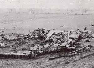 ![]() Un bombardero Handley Page Halifax HX332 del escuadrón número 10 de la RAF destruido a las afueras de Yorkshire. 5 de los 7 ocupantes fallecieron cuando el avión fue derribado por el Teniente Arnold Döring. Era uno de los 34 aviones dañados o destruidos en la operación. | ||||