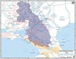 ![]() Frente Oriental durante la Operación Saturno, con los avances soviéticos (territorio azul). | ||||