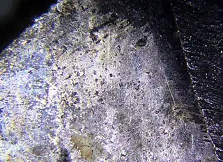 ![]() Orcelita en forma de granos microscópicos incluidos en pentlandita y maucherita.Distrito de Nipissing, Ontario (Canadá) | ||