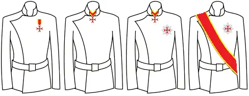 Los Caballeros de la Gran Cruz llevan una banda y una insignia o estrella en el lado izquierdo del pecho; Los comandantes usan una cruz alrededor del cuello; y los Caballeros usan una pequeña cruz en el pecho izquierdo del uniforme: