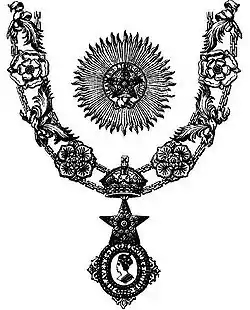 - El collar, también portado solo por los "Caballeros Grandes Comendadores", estaba fabricado en oro. Estaba compuesto por figuras alternas de lotos indios, rosas rojas y blancas, y ramas de palmeras, con una corona imperial en el centro.