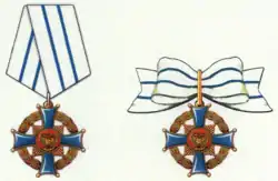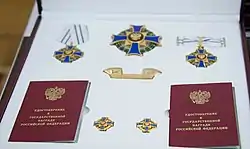 La insignia de la Orden es una cruz patada de plata dorada de 70 mm de ancho, con brazos que se ensanchan hacia los extremos exteriores cóncavos. El anverso de la cruz está esmaltado en azul. En su centro hay un medallón circular esmaltado en rojo con bordes dorados y con el escudo de armas dorado de la Federación Rusa. Una corona de laurel esmaltada en verde pasa por debajo y cerca de los extremos exteriores de la cruz. Los rayos dorados se extienden entre los brazos de la cruz hasta la corona de laurel. El reverso es liso (dorado) y lleva el número de serie del premio grabado en la parte inferior.[3]