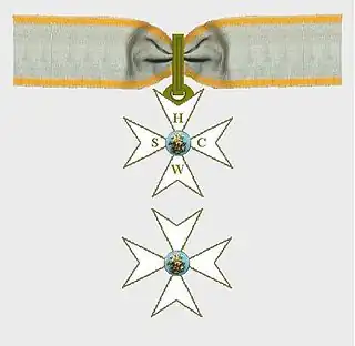 Su divisa es una cruz de ocho puntas de esmalte blanco orlada, pometada y angulada con llamas de oro, pendiente de una corona Real con las iniciales S. H. C. W. de oro en sus brazos, cargada con un medallón de esmalte azul orlado de oro. En el anverso el mote ilustribus et nobilitati y en el reverso la efigie del santo patrono con las iniciales P. P D. E. en los brazos. La cinta azul celeste con filetes amarillos. La placa es una cruz de ocho puntas, orlada y pometada de plata con los brazos en escama y angulada con llamas de oro.