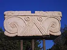 Algunas tumbas etruscas muestran un capitel similar, con dos grandes volutas que no están tumbadas, pero no hay palmetas en el centro.