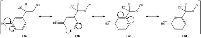 Los compuestos m-hidroxilados no se oxidan a m-bencenodioles ni carboxilatos. Por el contrario, forman ácidos fenilcarboxílicos. Las variaciones en las aptitudes migratorias de los anillos aromáticos pueden explicar esto. Los grupos hidroxilo en orto o para enlazados al carbonilo concentran la densidad de electrónica en el carbono aromático enlazado al carbonilo (10c, 11d). Los grupos fenilos poseen baja capacidad migratoria, pero una mayor densidad electrónica en el carbono incrementa la capacidad migratoria, facilitando la transposición [1,2] del arilo, permitiendo así que la reacción proceda. Los compuestos m-hidroxilados no concentran la densidad electrónica en el carbono que migra (12un, 12b, 12c, 12d) por lo que su capacidad migratoria permanece baja. El hidrógeno bencílico posee una capacidad migratoria más alta, por lo que emigra en lugar del arilo (8), formando así un ácido arilcarboxílico (9).