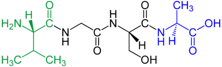 Para nombrar un péptido se empieza por el aminoácido que porta el grupo –NH2 terminal, y se termina por el aminoácido que porta el grupo -COOH. En el sistema clásico cada aminoácido se representa por tres letras, y en el moderno, impuesto por la genética molecular, por una letra. Si el primer aminoácido de nuestro péptido fuera alanina y el segundo serina tendríamos el péptido alanil-serina, Ala-Ser, o AS.