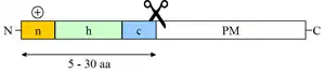 Un péptido señal (dependiendo de proteína Sec, eucariota) tiene tres regiones distintas. Primero la región n, que tiene aminoácidos con carga positiva (Lys, Arg, His) o negativa (Asp, Glu), después la región h, que es hidrofóbica, y por último la región c, que contiene el sitio de reconocimiento para la peptidasa señal (SPase).