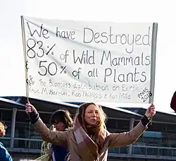 Las afectaciones a la biodiversidad pueden enmarcarse en el Antropoceno, actual era geológica en la cual la especie humana es quien determina los procesos fundamentales de la biósfera,[125] conduciendo así al cambio ambiental global.[126] Prácticamente todos los aspectos del cambio global son causados primordialmente por el rápido crecimiento de la población humana y el incremento en el consumo de recursos per cápita.[127] Este último es impulsado en gran medida por la lógica del sistema capitalista que constantemente busca crear mercancías para acumular riqueza, ya sea resolviendo necesidades básicas e histórico-sociales existentes o creando nuevas,[128] sin importar los costos ambientales y la injusticia que represente hacia otros animales y especies.[129]