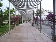 Pérgola en el exterior de un edificio de la Universidad de Gotemburgo.