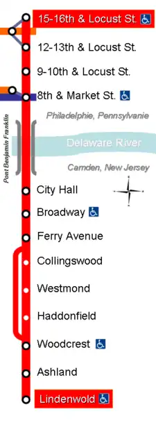 | Lindenwold | Lindenwold | transferencia a la línea Atlantic City del New Jersey Transit | Todos los trenes |