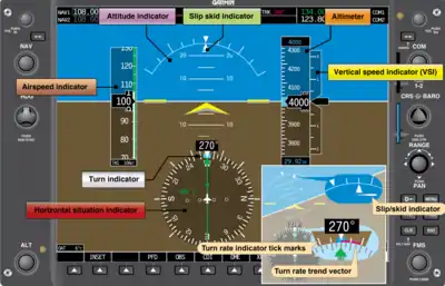 Otra información que se muestra en el PFD incluye información de marcadores de navegación, errores (para controlar el piloto automático ), indicadores de senda de planeo ILS , indicadores de desviación de rumbo , configuraciones QFE del indicador de altitud y mucho más.