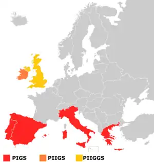 El término PIGS fue utilizado principalmente por medios anglosajones, especialmente británicos (por ejemplo Financial Times), para referirse a los países del sur de la Unión Europea. Estos países tienen también en común ser países de la periferia europea, lo que facilita los prejuicios históricos existentes en relación con los países mediterráneos o los prejuicios británicos sobre los irlandeses.[21] En ocasiones también se ha utilizado la expresión economía porcina.