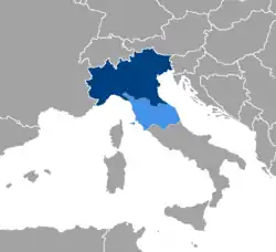 Padania (norte de Italia)      Padania (incluida Toscana, Umbría y Marcas. Estas tres regiones geográficamente forman parte de la península itálica, a diferencia del resto de Padania.)
