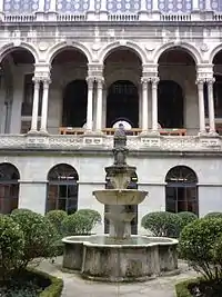 Es un espacio que condensa la luz y la traslada, a través de los vanos de las galerías, a todas las dependencias. En el centro se sitúa una fuente, alrededor de la cual se dispone un jardín, separado de las galerías por unas columnas balaustradas. La fuente procede del Antiguo Convento de Santo Domingo de La Guardia de Jaén y fue donada en 1955 por sus propietarios al Instituto de Estudios Giennenses para que ocupara, en un principio, el patio del Museo Provincial, hasta que fue instalada en su actual emplazamiento en 1961; fechada en 1577, es obra de Francisco del Castillo el Mozo, y refleja la advocación principal del convento dominico, Santa María Magdalena, que responde a la fecha de nacimiento del fundador Fray Domingo de Valtanás en el día de la festividad de la santa, el 22 de julio.