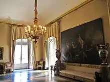En mayo de 1734 Carlos de Borbón entraba en Nápoles, la ciudad se convertía, de nuevo, en la capital de un reino autónomo y no de un virreinato.[21] El nuevo rey encontró el Palacio Real vacío y destartalado pues, ya desde su construcción, había sido normal que los virreyes se instalaran con sus muebles y que, una vez finalizado su mandato, se los llevaran consigo. Así lo habían hecho los últimos virreyes austriacos, el conde y la condesa Visconti en marzo de 1734. Lo único que quedaba en el palacio eran las magníficas bóvedas pintadas hechas por artistas napolitanos del seiscientos.[22]