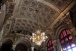 El acceso al edificio por la entrada principal conduce al Gran Salón (o Gran Vestíbulo), ubicado en el centro del edificio, un espacio notable de 40 x 18 metros y una altura de 24 metros diseñado «para dejar una impresión única en el visitante».[2] Su diseño, imitando la arquitectura interior de las termas Antoninas (los baños romanos de Caracalla)[6] en armonía con la bóveda pintada, le confiere un aire clásico. El color dominante de la sala, que reúne la mayor parte del enfoque artístico interior del edificio, es el dorado. Unas escalinatas a ambos lados conectan al vestíbulo con el primer piso, uniendo los despachos de las dos alas; en su día servía, entre otros, como sala de espera para el público, pero ya no tiene esta función.[2]