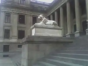 Con el paso de los años, dichas esculturas fueron deterioriándose hasta solo quedar dos, que fueron ubicadas en la escalinata de acceso, a ambos lados de la puerta principal. Es por ello que existe un marcado contraste entre el blanco del mármol de las esculturas y el gris del granito del resto del inmueble.