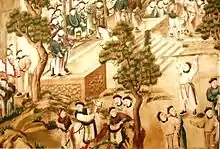Todos los paramentos, a excepción de los del escenario, están pintados con un papel pintado a mano en el que se representan distintas escenas de la vida de la China medieval, basadas en leyendas épicas. Es un ejemplo decorativo de la dinastía Qing que surge del gusto naturalista y realista de la pintura china clásica resultante del uso del dibujo a tinta.