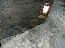 La puerta principal da acceso a zaguán abovedado que comunica con las diferentes estancias colindantes y el jardín. En el interior se conservan los orificios para atrancar las puertas y una pequeña aspillera que hacia las funciones de mirilla para controlar la puerta principal.