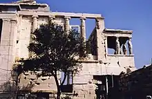 El olivo donde se encontraba el Pandrosio. Al fondo, el Erecteión.
