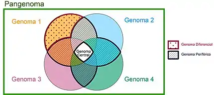 Con base en estos conceptos, un pangenoma puede dividirse en un “genoma central” (también conocido como “core genome”) el cual representa al conjunto de genes que están presentes en todos los individuos del clado, un “genoma periférico” (o “shell pangenome”) que contiene los genes presentes en dos o más organismos pero que no pertenecen al genoma central y, un “genoma diferencial” ( o “cloud pangenome”) referente al conjunto de genes únicos los cuales están presentes sólo en un organismo del clado[2][3][5].