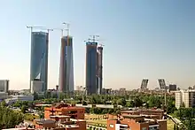 A ellos se añaden, por la singularidad de su silueta, las dos torres inclinadas de la Puerta de Europa (114 m) y la torre de comunicaciones Torrespaña (231 m).