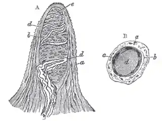 ![]() Papila de la mano, tratada con ácido acético. Aumentada 350 veces. A. Vista lateral de una papila de la mano. a. Capa cortical. b. Corpúsculo táctil. c. Pequeño nervio de la papila, con neurolema. d. Hay dos fibras nerviosas corriendo en forma de bobina espiral alrededor del corpúsculo táctil. e. Final aparente de una de estas fibras. B. Papila táctil vista desde arriba para mostrar su sección transversal. a. Caoa cortical. b. Fibra nerviosa. c. Capa externa del cuerpo táctil, con su núcleo. d. Sustancia interior clara. | ||