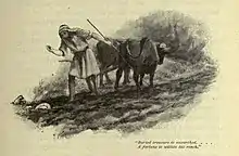 El reino de los Cielos es como una persona que tenía un tesoro escondido en su campo pero no lo sabía. Y [cuando] murió se lo dejó a su [hijo]. El hijo tampoco lo sabía. Se hizo cargo del campo y lo vendió. El comprador fue a arar, [descubrió] el tesoro y empezó a prestar dinero con intereses a quien quisiera. Evangelio de Tomás 109, traducción Patterson/Meyer