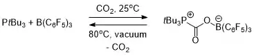 El calentamiento de la intermolecular compuesto FLP-CO2 en bromobenceno a 80 °C bajo vacío durante 5 horas causó la liberación de aproximadamente la mitad de la CO 2 y la regeneración de los dos componentes constituyentes de la FLP. Después de varias horas más de estar sentado a temperatura ambiente al vacío, se produjo una liberación total de CO2 y regeneración de FLP.[16]