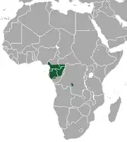 Se encuentra en Camerún, República Centroafricana, República del Congo, República Democrática del Congo, Guinea Ecuatorial y Gabón.