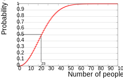 Ahora, 1 - p es la probabilidad de que al menos dos personas tengan el mismo día de cumpleaños. Para n = 23 se obtiene una probabilidad de alrededor de 0,507.