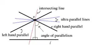 Como en la ilustración a través de un punto a que no está en la línea l hay dos paralelas límite, una por cada dirección punto ideal de la línea l. Separan las líneas que se intersecan con la línea l y las que son ultra paralelas a la línea l.