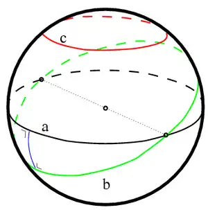 En la geometría esférica, todas las geodésicas son grandes círculos. Los grandes círculos dividen la esfera en dos hemisferios iguales y todos los grandes círculos se cruzan entre sí. Por lo tanto, no hay geodésicas paralelas a una geodésica dada, ya que todas las geodésicas se cruzan. Las curvas equidistantes en la esfera se llaman paralelos de latitud análogos a las líneas de latitud en un globo terráqueo. Los paralelos de latitud pueden ser generados por la intersección de la esfera con un plano paralelo a un plano que pasa por el centro de la esfera.