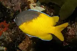 De cuerpo comprimido y fusiforme, la coloración base de cuerpo y aletas dorsal, anal y caudal, es amarilla. La cabeza y la mitad de la parte anterior y superior del cuerpo, es de color gris. La boca es blancuzca. Las aletas dorsal y anal están bordeadas en el margen de azul claro.
