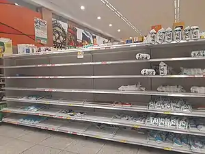 La paralización vial provocó desabastecimiento de varias ciudades del país: es así que Cuenca, Quito, Latacunga, Ambato, Tulcán, Ibarra, Riobamba, y muchas otras urbes, principalmente de la sierra y la amazonía presentaron una escasez de gas.[8] El Mercado Mayorista de Quito amaneció cerrado, al igual que el Mercado de San Roque (los dos mercados más grandes de la capital); sin embargo, tras la intervención policial, ambos centros de abasto fueron abiertos,[79] no obstante, la falta de productos impidió su pleno funcionamiento.