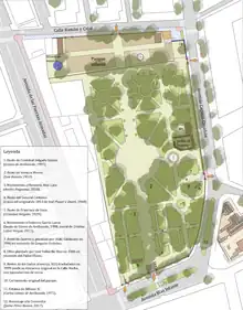 En el parque está situado un busto de Francisco de Goya realizado por Cristóbal Delgado Gómez en 1959 y otro del General Castaños realizado en 1948 según se dice con el bronce de cañones franceses y que se encontraba antes en la Avenida Blas Infante,[11] también es posible encontrar parte de unos baños árabes trasladados desde la calle Rocha donde aparecieron en 1997 y una reconstrucción de la noria que debieron poseer. El paseo se encuentra cerrado por un muro en parte de la fachada este y por rejas metálicas en el resto; tiene cinco entradas, dos en la fachada sur, dos en la norte y una en la fachada este.