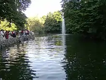 El estanque y la cascada fue una obra planeada por Ramón Oliva. Su traza se adornó con islas y una montaña artificial imitando a una gruta de la que caía una cascada. También se proyectó un surtidor en el medio del lago y la existencia de una barcaza de remos destinada a pasear a los niños y sus acompañantes.[3] Se construyó con piedra y un revestimiento de cal viva. Se finalizó la obra en marzo de 1879.[50] La cascada se montó sobre una montaña artificial hecha con material de derribo (en parte aprovechado del desmantelamiento de la antigua casa Consistorial). La gruta para la cascada fue objeto de polémica pues para darle mayor realismo se trajeron desde una gruta de Atapuerca auténticas estalagmitas. El escándalo fue tal que tuvo que intervenir el ministro de Fomento. En 1880 ya caía el agua por las rocas.[25] Antes de concluir las obras, en 1879 llegó al estanque la primera pareja de cisnes, regalo del vicecónsul francés Louis Bovilac al Ayuntamiento de Valladolid.[51]