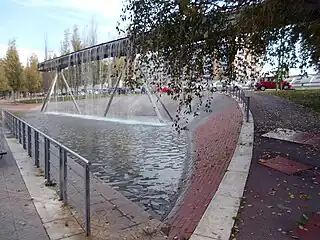 En cuanto a las calzadas laterales fueron diseñadas como un parque lineal que combina zonas verdes y espacios urbanos con nuevas plazas y áreas de recreo, en un entramado de formas sinuosas y tramos de ligera pendiente. Se instalaron diversas zonas infantiles y otros servicios, y un mobiliario urbano del que destacan unos bancos de diferente diseño: caracol, golondrina, estrella, espiral o boomerang. Otro elemento destacado es un canal de agua elevado que conecta cuatro estanques, generando unos saltos de agua en cada uno.[8]