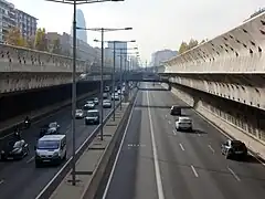 La primera actuación fue ganar terreno aumentando las calzadas laterales 3,5 m en voladizo sobre la carretera, con lo que la visión de la calzada central quedó reducida de 57 m a 22 m.[5] Sobre el margen de estos voladizos se instalaron una serie de pantallas acústicas para proteger a los vecinos del ruido del tráfico, diseñadas por Enric Miralles, Benedetta Tagliabue y Joan Callís, y realizadas en hormigón, de 4 m de altura, con pequeñas oberturas con vidrios de distintos colores, lo que crea un agradable efecto visual que otorga esteticidad a un elemento de simple cerramiento.[6]