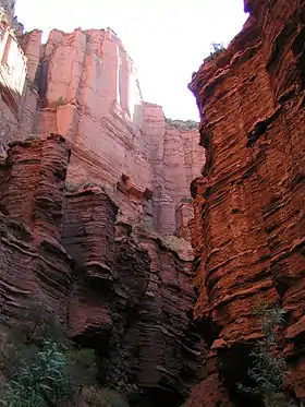 Los farallones, con sus acantilados, cornisas y terrazas, tienen un color rojizo. Apenas cubiertas de vegetación, delimitan un inmenso anfiteatro natural.